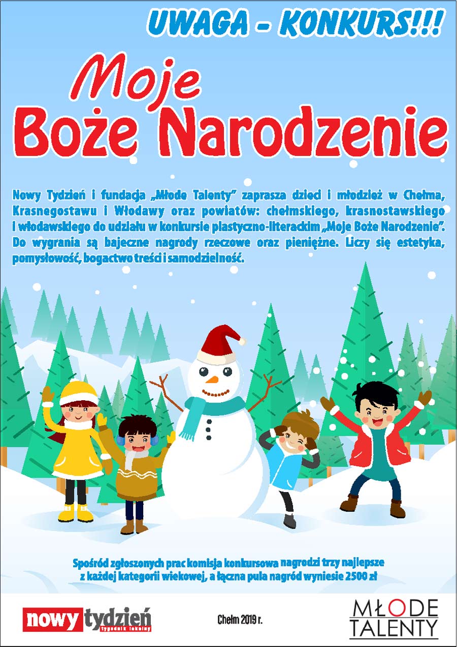 Nowy Tydzień i Fundacja „Młode Talenty” zapraszają dzieci i młodzież w Chełma, Krasnegostawu i Włodawy oraz powiatów: chełmskiego, krasnostawskiego i włodawskiego do udziału w konkursie plastyczno-literackim „Moje Boże Narodzenie”. Do wygrania są bajeczne nagrody rzeczowe oraz pieniężne. Liczy się estetyka, pomysłowość, bogactwo treści i samodzielność.