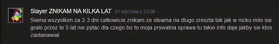 W nocy 21 stycznia, czyli 4 dni przed zabójstwem, na platformie Steam Łukasz W. pożegnał się z internetowymi znajomymi: „Siema wszystkim za 2-3 dni calkowicie znikam ze steama na dlugo zreszta tak jak w nicku (Slayer znikam na kilka lat – przyp. red.) milo sie gralo przez te 5 lat nie pytac dla czego bo to moja prywatna sprawa tu takie info daje jakby sie ktos zastanawial” (pisownia oryginalna). (pc)