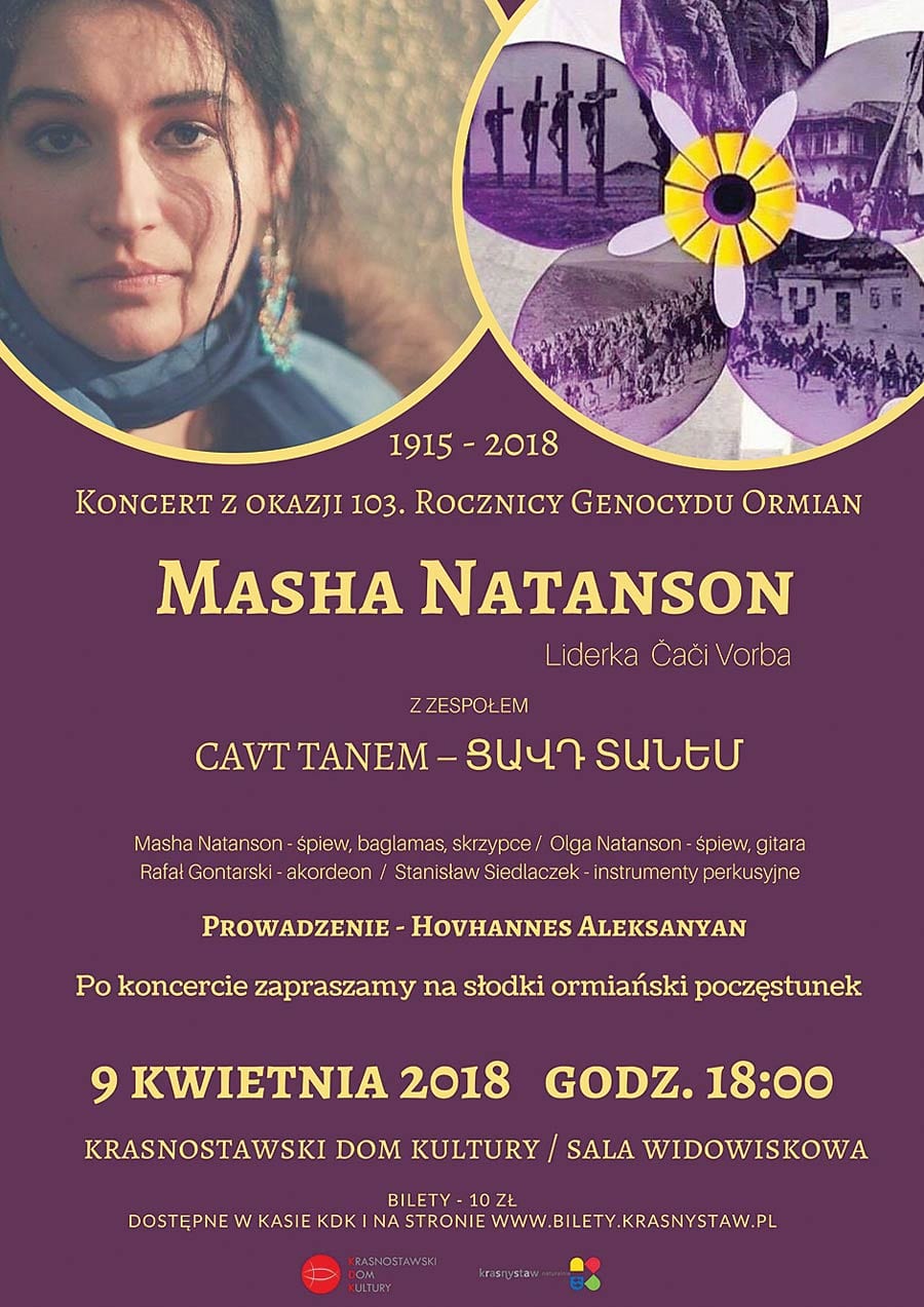Krasnostawski Dom Kultury zaprasza 9 kwietnia o 18.00 na koncert z okazji 103. rocznicy Genocydu Ormian. Wystąpi Masha Natanson z zespołem Cavt Tanem. Bilety w cenie 10 zł do nabycia w kasie KDK i na stronie www.bilety.krasnystaw.pl.