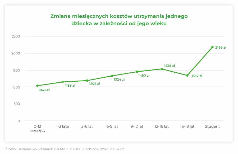 Wydatki „na dziecko” zaczynają się jeszcze przed jego przyjściem na świat. Z raportu wynika, że ciąża oraz przygotowanie siebie i gospodarstwa domowego na pojawienie się nowego członka rodziny to łączny średni wydatek ok. 8500 zł. Wraz z rośnięciem dziecka rosną jego koszty utrzymania. Jak analizują badacze, średnie miesięczne wydatki ponoszone na jedno dziecko w okresie niemowlęcym to niespełna 1050 zł, w wypadku nastolatka jest to już ok. 1500 zł, zaś studenta – niemal 2200 zł.