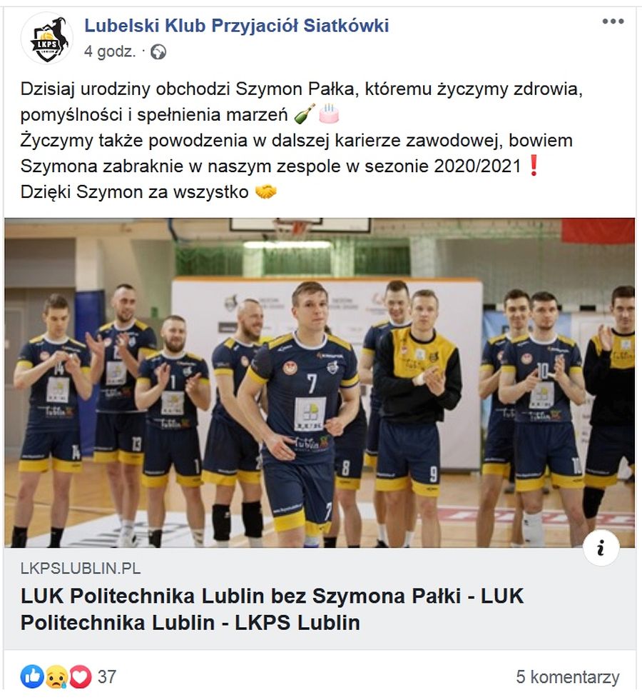 LKPS Lublin złożył 11 maja na swoim profilu na Facebooku życzenia urodzinowe Szymonowi Pałce, po czym poinformował, że zabraknie go w zespole na sezon 2020/2021!