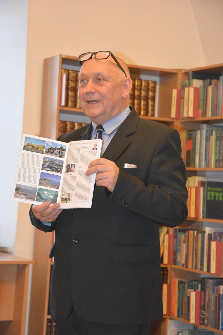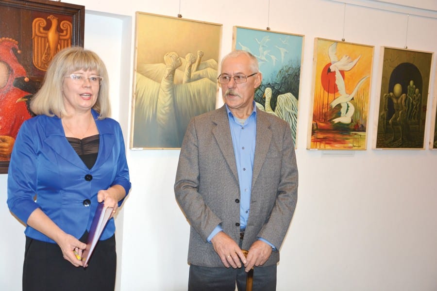 Stanisław Dobrowolski urodził się w 1958 r. na ziemi chełmskiej w rodzinie robotniczej, w środowisku, które nazywa „kresowo-mieszanym”. – Chłonął opowieści, pieśni i zachowania ludzi z Kresów, Syberii i innych stron. Życie dorosłe było ciężką pracą, obserwowaniem natury z bliska, zapisywaniem i przetwarzaniem na rysunki i obrazy. W bezwzględnej walce o przetrwanie odnalazł podobieństwo do ludzkich zachowań, stąd w jego pracach trawestacje ludzi, zwierząt i roślin – opowiada Dorota Korkosz z PBP. Dobrowolski uczestniczył w wielu wystawach indywidualnych i zbiorowych, jest autorem ilustracji i okładek antologii i tomików poezji. Rysunki publikował w kilku czasopismach. Współpracował z Galerią Wsi Polskiej przy Fundacji Kultury Wsi w Warszawie. Od 2000 r. współorganizuje międzynarodowe plenery plastyczne w Wierzbicy. Druga część spotkania odbyła się w czytelni, gdzie wszyscy goście otrzymali najnowszy numer Nestora, a redaktor naczelny Andrzej David Misiura przedstawił treść najnowszego wydania czasopisma. Poświęcone jest ono w większości ważnym faktom historycznym z życia Krasnegostawu, możemy również znaleźć w nim losy osób i rodzin związanych z Ziemią Krasnostawską. (kg)