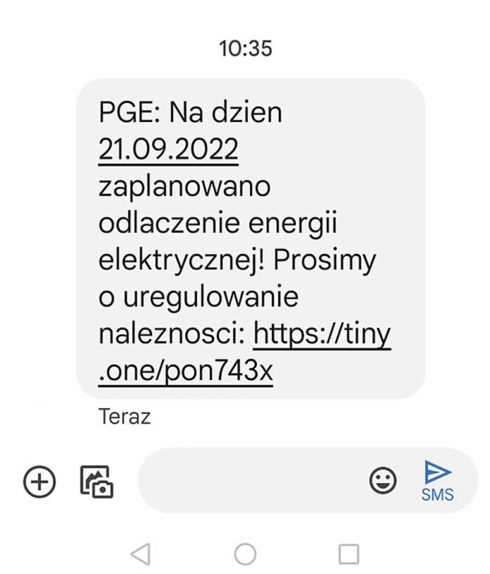 – Już po raz któryś otrzymałam taką wiadomość. Wcześniej podana była kwota do zapłaty, nieco ponad trzy złote. Tym razem przyszła tylko informacja o zaplanowanym na 21 września odłączeniu energii i ogólna prośba o uregulowanie należności, a także link do rzekomych płatności – mówi pani Elżbieta, która dobrze wie, że tego typu SMS to zwykła próba oszustwa.