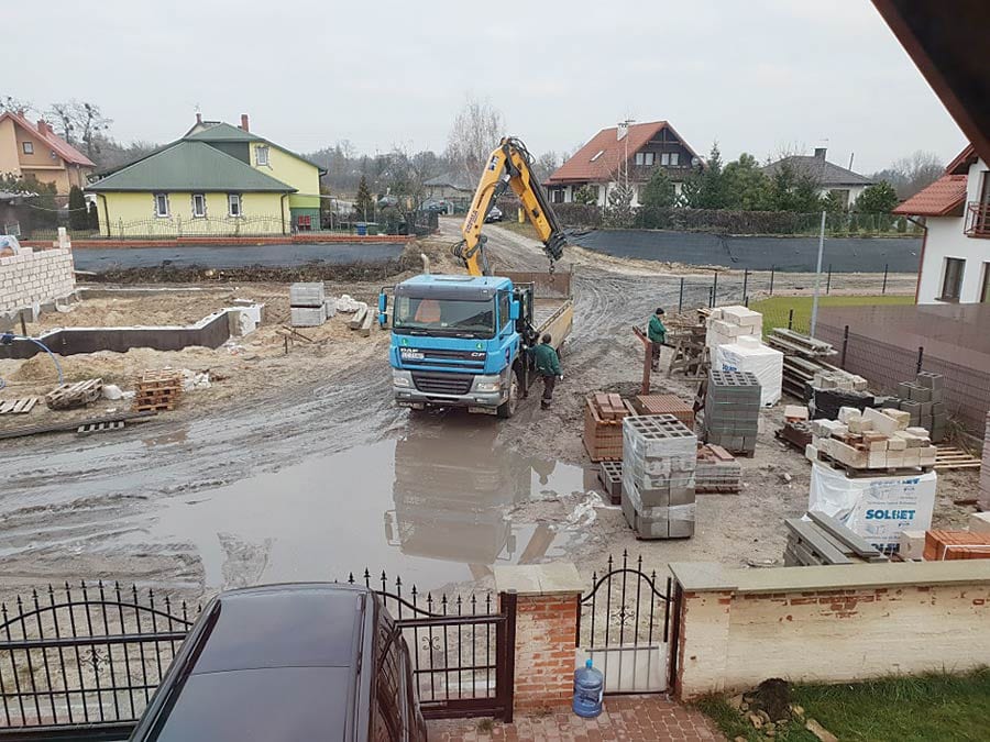 Naprzeciwko posesji zalegają materiały budowlane, palety z pustakami i cegłami. Ciężki sprzęt, który je dowozi dodatkowo niszczy coś, co i tak trudno nazwać drogą.