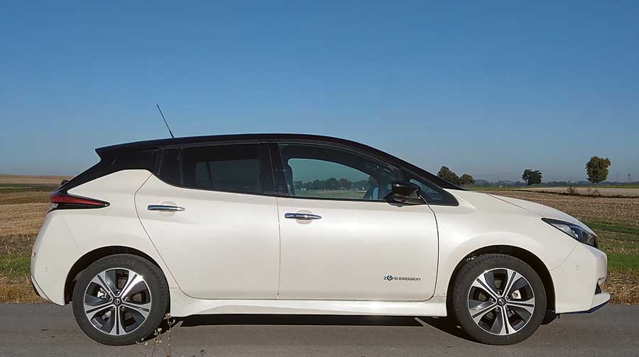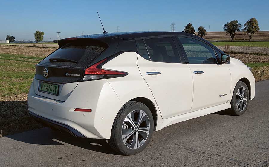 Oznaczenie e+ w nazwie modelu oznacza, że baterie wmontowane w podłogę samochodu mają zwiększoną pojemność do 62 kWh, a elektryczny silnik ma większą moc. Z zewnątrz o tym, że mamy do czynienia z najmocniejszą wersją japońskiego elektryka informują nas tylko błękitne, ale bardzo dyskretne wstawki w dolnej części zderzaków. Poza tym e+ niczym nie różni się od zwykłego Leafa. Samochód prezentuje się bardzo zgrabnie. Przód dzieli z Micrą, która jest w opinii wielu jednym z najładniejszych aut w segmencie B. Tył również budzi pozytywne emocje.