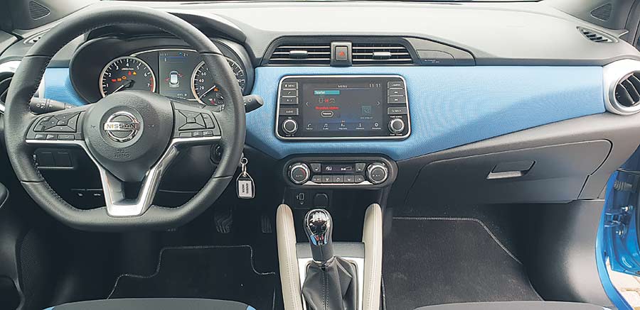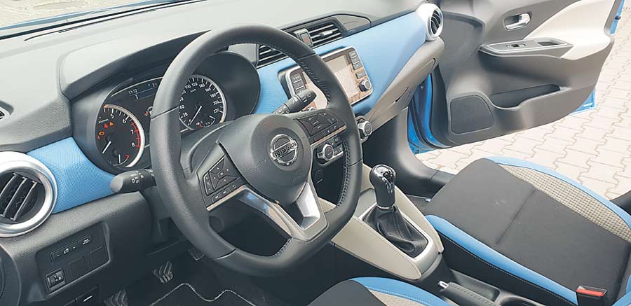 Micra ma też piękne wnętrze – przemyślane, o ładnym rysunku i wykonane z dobrych materiałów, które wyglądają na jeszcze lepsze niż są w rzeczywistości. Deska rozdzielcza jest zbudowana w minimalistycznym stylu. Znalazły się na niej jedynie centralny wyświetlacz i panel sterowania nawiewami i klimatyzacją. Jej środkowa część oraz boczki foteli zostały obszyte materiałem w kolorze nadwozia, co sprawia fenomenalne wrażenie.