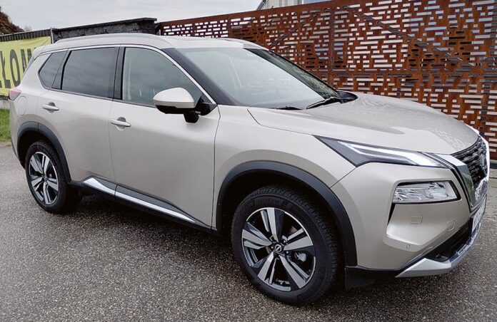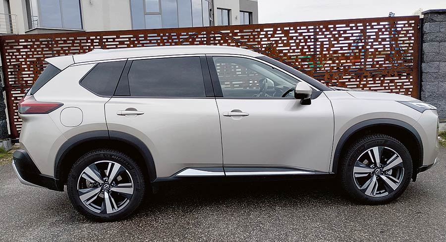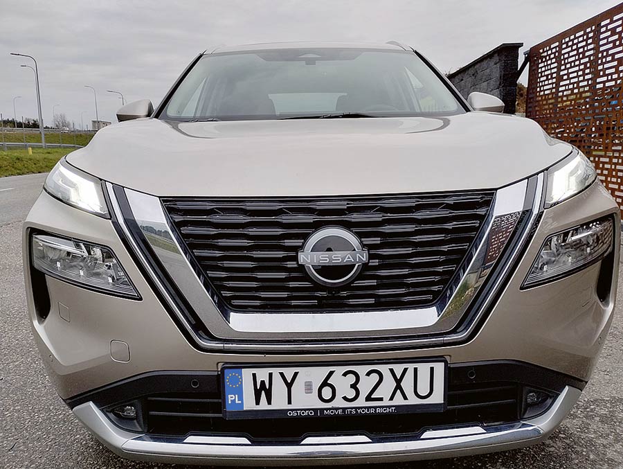 X-Trail, jak na dużego SUV-a przystało, prezentuje się godnie, by nie użyć słowa monumentalnie. Ma słuszne gabaryty, pionowy przód i niemal poziomo poprowadzoną linię maski. Ma też bardzo modne obecnie podwójne reflektory oraz dużą atrapę chłodnicy. Dolna część nadwozia jest osłonięta czarnymi listwami, które korespondują z takimi samymi lusterkami oraz również czarnym dachem i słupkami. Nadwozie oparto na 19-calowych kołach. Kabina wykończona jest czarną oraz brązową skórą (sztuczną oczywiście).