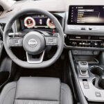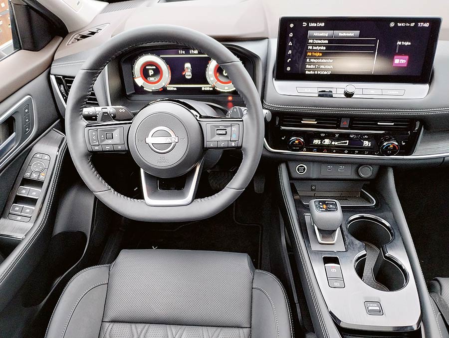 Praktycznie wszędzie znajdziemy miękkie i bardzo przyjemne w dotyku materiały. Rysunek deski rozdzielczej jest klasyczny: duży wyświetlacz centralny na górze, pod nim analogowy panel sterowania klimatyzacją, a jeszcze niżej tunel środkowy z ładowarką indukcyjną, wybierakiem kierunku jazdy, kilkoma przyciskami, w tym do wspomagania zjazdu ze wzniesień, oraz pokrętłem do wyboru jednego z pięciu trybów jazdy. Kierownica jest okrągła i posiada charakterystyczne dla Nissana wąskie dwa ramiona, na których rozmieszczono przyciski do obsługi komputera oraz audio. Wszystko jest proste, czytelne i bardzo intuicyjne.