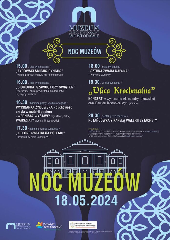 Już w sobotę (18 maja) Muzeum – Zespół Synagogalny we Włodawie otworzy swoje podwoje dla zwiedzających w ramach Nocy Muzeów. Z tej okazji przygotowano wiele atrakcji, w tym warsztaty, pokazy, koncert a nawet potańcówkę.