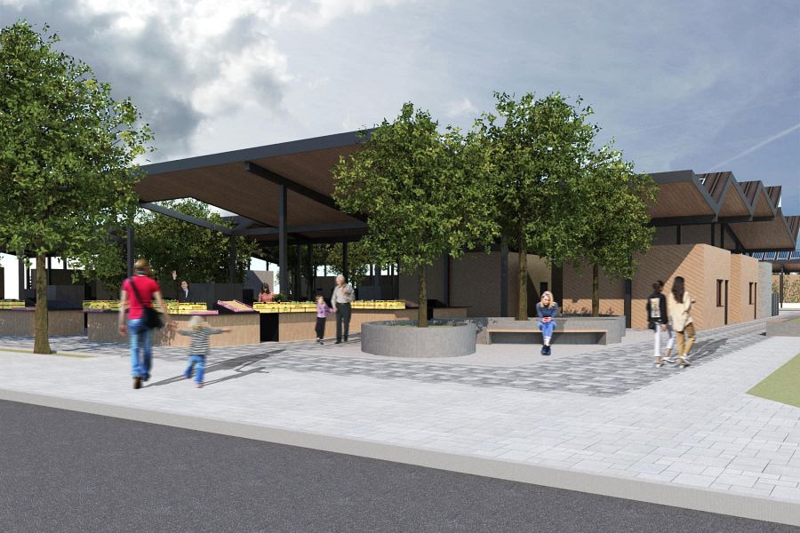 Na terenie obecnie funkcjonującego targowiska (w części pomiędzy ul. Okulickiego i Targową oraz na terenie od ul. Targowej w stronę torów kolejowych), powstanie zadaszenie pokryte w części panelami fotowoltaicznymi. Zmieniony zostanie także układ funkcjonalno-komunikacyjny targu. Całość obiektu ma być bardziej otwarta, dostępna i stanowić atrakcyjne, pod kątem architektonicznym, miejsce handlowe z aranżacją zieleni.