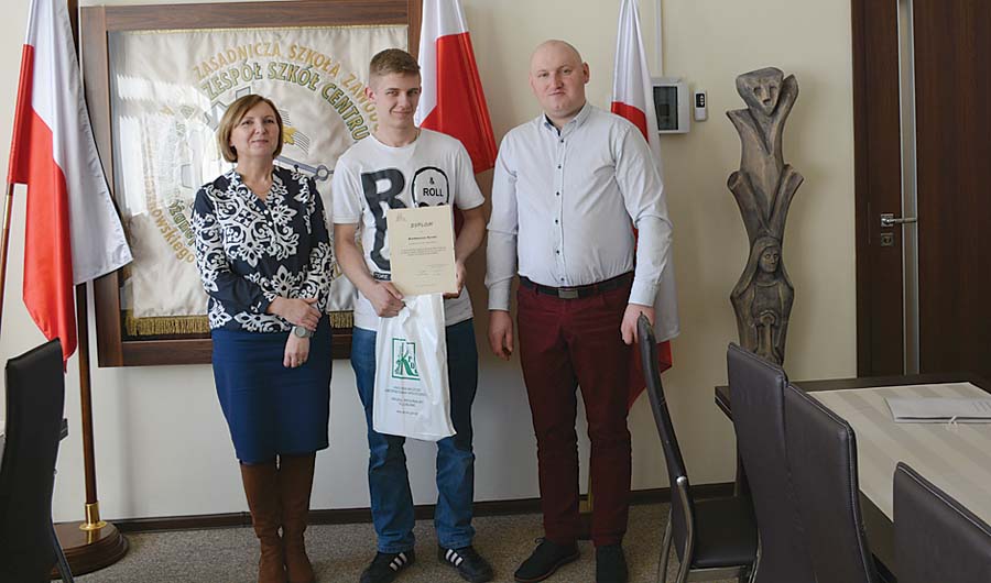 Konkurs ma na celu popularyzowanie wśród młodzieży szkolnej znajomości dobrej praktyki rolniczej ze szczególnym uwzględnieniem zagrożeń i zasad bezpiecznej pracy w gospodarstwach rolnych, kształtowanie umiejętności praktycznego zastosowania wiedzy z zakresu dobrej praktyki rolniczej oraz szerzenie idei bezpiecznej pracy wśród młodych rolników. W zmaganiach wzięło udział m.in. pięciu uczniów z klasy II BTP ZS CKR Siennica Różana: Patryk Dominik, Bartłomiej Kawka, Wojciech Młynarczyk, Dawid Tokarczyk i Jakub Żeliszczak. Uczestnicy mieli do rozwiązania test składający się z trzydziestu pytań. Zwyciężył Bartłomiej Kawka i to on będzie reprezentował ZS CKR na etapie centralnym, który odbędzie się 18 kwietnia w Szkole Głównej Gospodarstwa Wiejskiego w Warszawie. Drugie miejsce zajął Jakub Żeliszczak, a trzecie Dawid Tokarczyk. Nad prawidłowym przebiegiem konkursu czuwali: Piotr Padziński (przedstawiciel Placówki Terenowej KRUS w Krasnymstawie) oraz nauczyciel Krzysztof Rękas. Nagrody dla zwycięzców ufundowała KRUS w Krasnymstawie, a ich wręczenia dokonali – Justyna Przysiężniak kierownik KRUS w Krasnymstawie, Piotr Padziński i dyrektor ZS CKR Jacek Jagiełło. (k)
