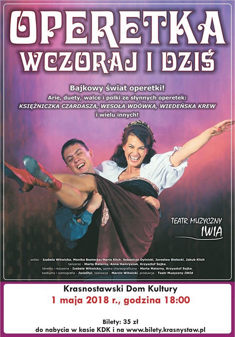 Krasnostawski Dom Kultury zaprasza 1 maja o godz. 18.00 do sali widowiskowej na operetkę „Wczoraj i dziś” w wykonaniu Teatru Muzycznego IWIA. Bilety w cenie 35 zł do nabycia na stronie www.bilety.krasnystaw.pl i w kasie KDK.