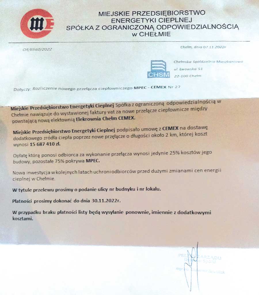Niedowierzanie malowało się w oczach tych mieszkańców ChSM, którzy w środowe przedpołudnie (16 listopada) zajrzeli do swoich skrzynek pocztowych. W środku ujrzeli pismo z wezwaniem do zapłaty, opatrzone logotypami spółdzielni i Miejskiego Przedsiębiorstwa Energetyki Cieplnej w Chełmie wraz z pieczątką i podpisem prezesa miejskiej spółki.