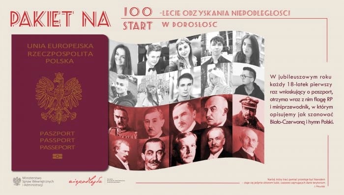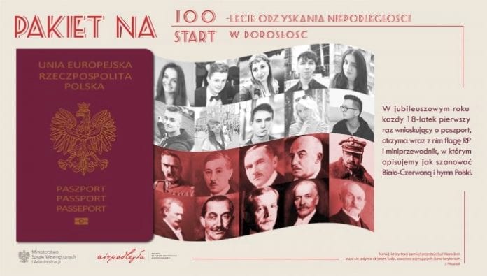 Z okazji przypadających w tym roku obchodów 100-lecia odzyskania przez Polskę niepodległości 18-latkowie odbierający paszport dostaną razem z dokumentem pakiet, w którym znajdzie się flaga RP, miniprzewodnik na temat symboli narodowych oraz wpinany znaczek „Niepodległa”.