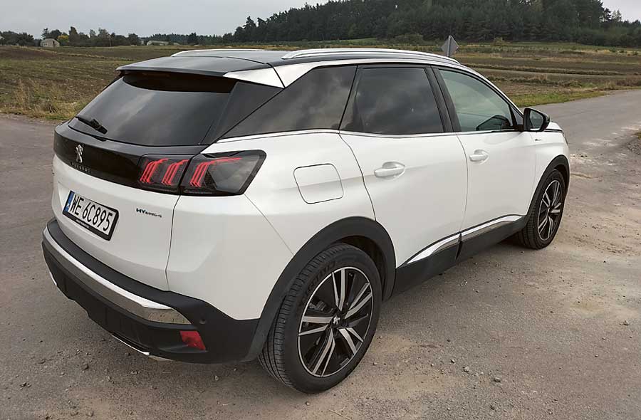 Z zewnątrz najmocniejsza odmiana 3008 różni się od standardowej porozrzucanymi po całej karoserii emblematami z napisem „hybrid”. Mimo że ma aż 300 koni mocy, na zewnątrz kompletnie tego nie widać. I bardzo dobrze, bo to nie jest auto stricte sportowe. Jak na SUV-a, prezentuje się bardzo atrakcyjnie. Agresywne linie zderzaka i dymione klosze tylnych świateł wyglądają obłędnie.