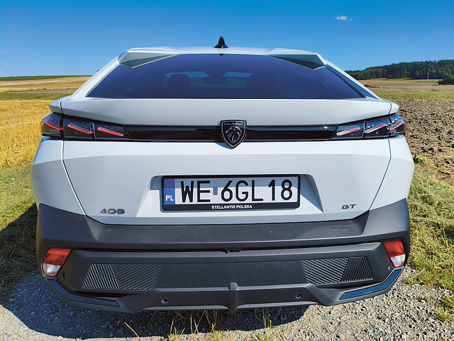 Peugeot 408 przyciąga wzrok – to nie ulega wątpliwości. Nadwozie o dynamicznej, atletycznej linii, agresywnie zarysowany przód z „kłami lwa” jako światłami do jazdy dziennej i masywna atrapa chłodnicy z ciekawym wzorem przywodzą na myśl auta koncepcyjne. Tylna część nadwozia z łagodnie opadającą linią dachu w stylu fastbacka nadaje całości elegancji. Choć wygląda sportowo, 408 jest stosunkowo duży – ma ponad 4,6 m długości i spory rozstaw osi, co przekłada się na przestronność kabiny. Wnętrze to zdecydowany punkt programu.