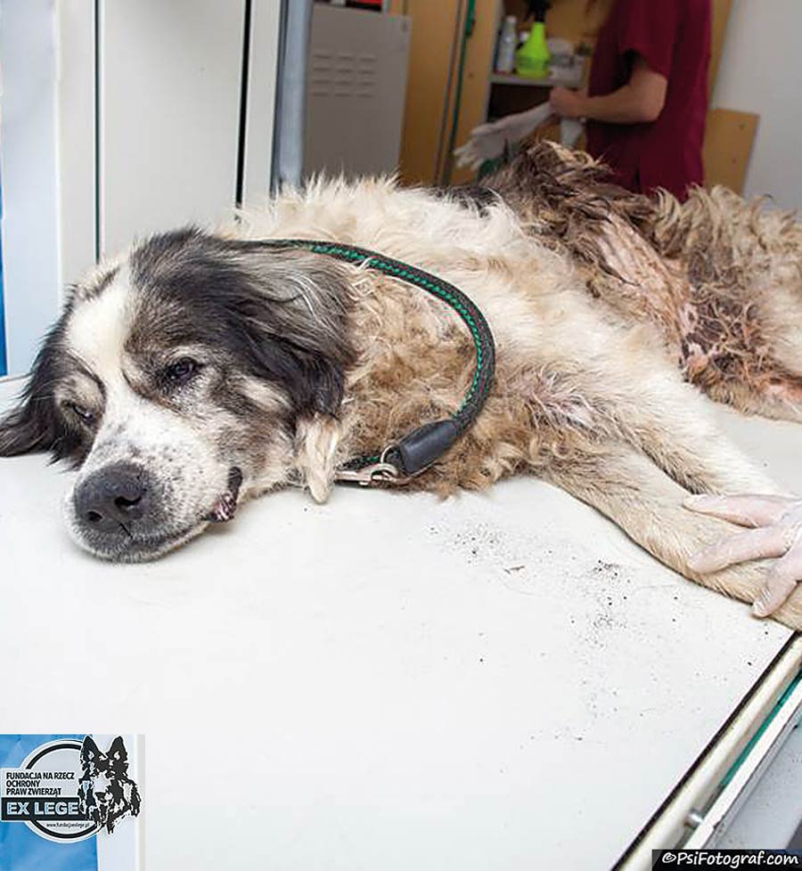 Pies leżał pod kościołem w jednej z podlubelskich wsi w niedzielę (5 sierpnia). Z trudem oddychał. Jego przerzedzona, skołtuniona i zalepiona brudem sierść, wśród której kłębiły się liczne pasożyty, odkrywała zaczerwienienia na brzuchu. Wierni mijali zwierzę, wchodząc na mszę. Zareagowała tylko jedna osoba – kilkunastoletnia dziewczyna, która odwiedziła tę miejscowość i uczestniczyła wraz z rodziną w nabożeństwie. Zaalarmowała Fundację na Rzecz Ochrony Praw Zwierząt Ex Lege.