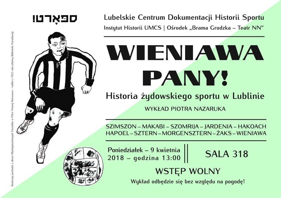 Instytut Historii UMCS, Lubelskie Centrum Dokumentacji Historii Sportu oraz Ośrodek „Brama Grodzka–Teatr NN” zapraszają w najbliższy poniedziałek, 8 kwietnia o godzinie 13, na wykład Piotra Nazaruka pt. „Wieniawa Pany! Historia żydowskiego sportu w Lublinie”.