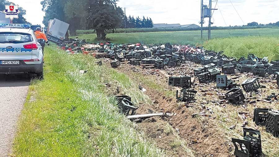 Jak wynika ze wstępnych ustaleń krasnostawskich policjantów kierujący ciężarówką, na której znajdowało się ok. 200 transporterów piwa o łącznej wadze 22 t, jadąc w stronę Krasnegostawu, nagle zjechał do rowu, w wyniku czego towar wypadł z pojazdu na pole. 32-letni kierowca w rozmowie z policjantami stwierdził, że nie wie, jak do tego doszło. Był trzeźwy i nie odniósł obrażeń ciała. Ciągnik siodłowy marki Renault, jak się okazało, nie miał aktualnych badań technicznych. Kierowca został ukarany mandatem w wysokości 1 000 zł. (s)