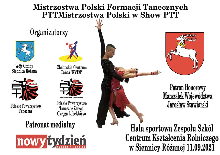 Wieloletnia, bardzo pracowita i owocna partnerska współpraca z Urzędem Gminy w Siennicy Różanej inauguruje jedenasty rok wspólnych działań artystycznych. W dniu 11 września odbędą się Mistrzostwa Polski Formacji Tanecznych oraz Show Par, Grand Prix Polski PTT oraz XI Ogólnopolski Turniej Tańca Towarzyskiego o Puchar Wójta Gminy Siennica Różana Rytm 2021.