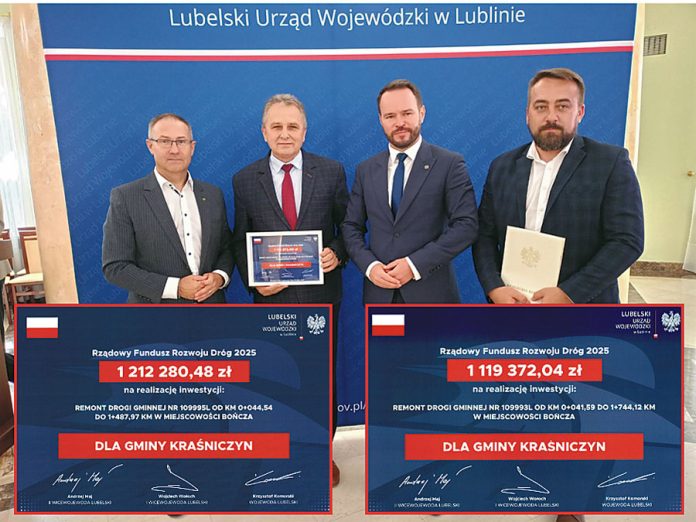 Z dotacji w ramach tegorocznego podziału RFRD Kraśniczyn cieszył się już na początku września, kiedy wójt Jan Chorągiewicz podpisał z wojewodą Krzysztofem Komorskim umowę na dofinansowanie zadania pn. „Remont drogi gminnej nr 109995L od km 0+044,54 do km 1+487,97 w miejscowości Bończa”, które znalazło się na liście podstawowej. Dotacja z RFRD w wysokości ponad 1,21 mln zł ma pokryć 80 proc. kosztów inwestycji oszacowanej na przeszło 1,51 mln zł. Dwa tygodnie później przyszła kolejna dobra wiadomość.