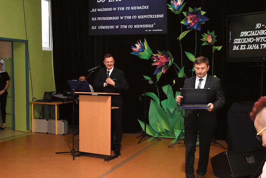Pokaz zdjęć i filmów z dziejów szkoły rozbudził wspomnienia nauczycieli i pracowników Ośrodka. Później P. Huczuk odbierał moc prezentów i podziękowań od wielu gości. Wśród nich nie mogło zabraknąć wicestarosty Tomasza Korzeniewskiego, burmistrza Włodawy Wiesław Muszyńskiego i wójta gminy Włodawa Dariusza Semeniuka. Przybył również wicekurator Mirosław Wójcik, który zakończył swoje wystąpienie… rewelacyjnym songiem ku chwale szkoły.