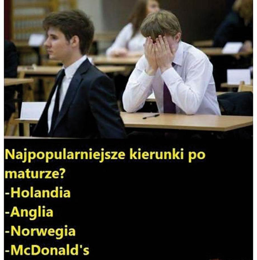 – Czy zawieszonej, ale – bądź co bądź – dyrektor liceum, a także nauczycielce geografii, przystoją takie żarty? W końcu przez trzy lata przygotowuje swoich uczniów do egzaminu dojrzałości, a po nim wieści im co najwyżej pracę za granicą lub w McDonald’s. I to ma być motywacja do nauki? – pyta nas zniesmaczony Czytelnik, który na facebookowym profilu Klasury zobaczył „mema”, którym podzieliła się ze swoimi znajomymi zawieszona dyrektor II LO.