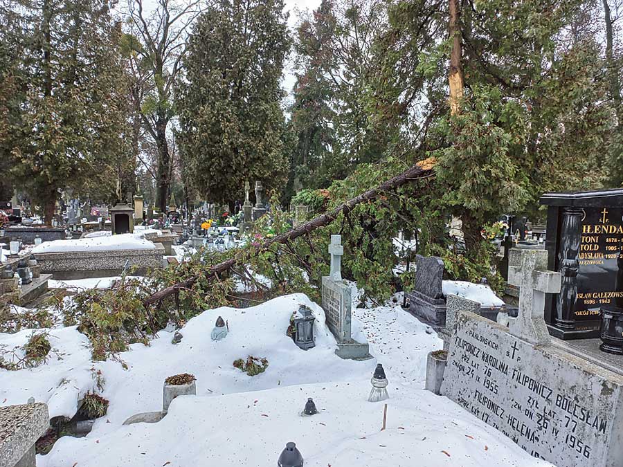 Intensywne, grudniowe opady śniegu sprawiły, że w wielu miejscach zostały połamane drzewa lub ich gałęzie. Zniszczenia nie ominęły również cmentarza parafialnego przy ulicy Lwowskiej.