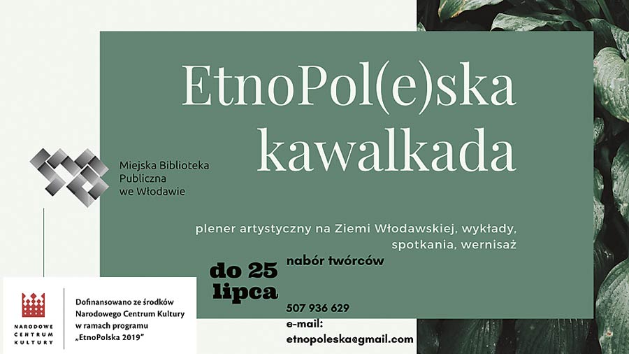 Miejska Biblioteka Publiczna we Włodawie w ramach zadania „EtnoPol(e)ska kawalkada” ogłasza otwarty nabór na plener artystyczno-literacki dla twórców lokalnych. Nabór trwa do dnia 25 lipca. Zadanie realizowane jest dzięki dofinansowaniu ze środków Narodowego Centrum Kultury w ramach programu EtnoPolska 2019. W programie pleneru: warsztaty, wykłady oraz spotkania z ciekawymi badaczami i artystami.