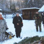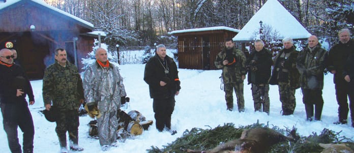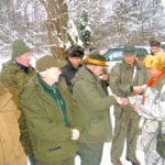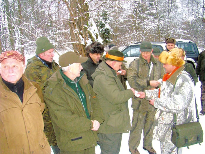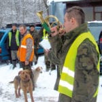 Nareszcie będzie okazja sprawdzić w praktyce zalety i wady tej metody polowań. Nurtuje pytanie czy sprawdzi się w naszych warunkach? W ciszy i skupieniu, rozwożeni podwodą, trafiamy na wylosowane stanowiska. Organizatorzy ustawili w kniei 40 osikowych zwyżek. Około godziny po ruszeniu naganki pada pierwszy strzał. Czekamy nadal, trochę zmarznięci wypatrujemy zwierzyny. Jest czas na posiłek i łyk gorącej kawy. W końcu na leśnej drodze, przed świerkowym młodnikiem, staje byk. To „selekcyjny szpicer”. Niczym niepokojony, spokojnie przemieszcza się w leśną dal. Gdyby nie wykonany już plan odstrzału, pewnie by już leżał na pokocie, a tak uszedł cało, ciesząc oko myśliwych. Po dwóch godzinach słychać, że naganiacze pracują z drugiej strony, słychać słabe ujadanie psów. Gdzieś tam padają kolejne pojedyncze strzały. Bardzo powoli miot dobiega końca. Słychać zbliżającą się podwodę. Zmęczeni, trochę zziębnięci ale zadowoleni schodzimy z ambon i siadamy do podwody, wymieniamy się wiadomościami i uwagami z przebiegu polowania. Jak efekty? Wieści z miotu niosą, że są pozyskane jelenie – dwie łanie. To Andrzej i Mirek wpisują się na listę szczęściarzy. Przy gajówce płonie już ognisko i czeka przygotowane przez Janka posłanie „igliwie pod pokot”. Prowadzący składa raport, ogłasza Króla polowania, prezes dekoruje okolicznościowym medalem. Sygnaliści grają sygnał „Jeleń na pokocie” a uczestnicy polowania z odkrytymi głowami oddają hołd upolowanej zwierzynie, dziękując kniei za bezpieczne i udane łowy. Prowadzący ogłasza koniec polowania i prosi na poczęstunek. Zmrok pomału zapada nad gajówką, w ciepłej stanicy przy stołach siedzą i gwarzą myśliwi. Przy „kaszy i Andrzejowym gulaszu” trwają rozmowy, nie tylko o polowaniu. Aż szkoda, że już czas wracać do domu. (db)