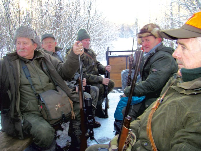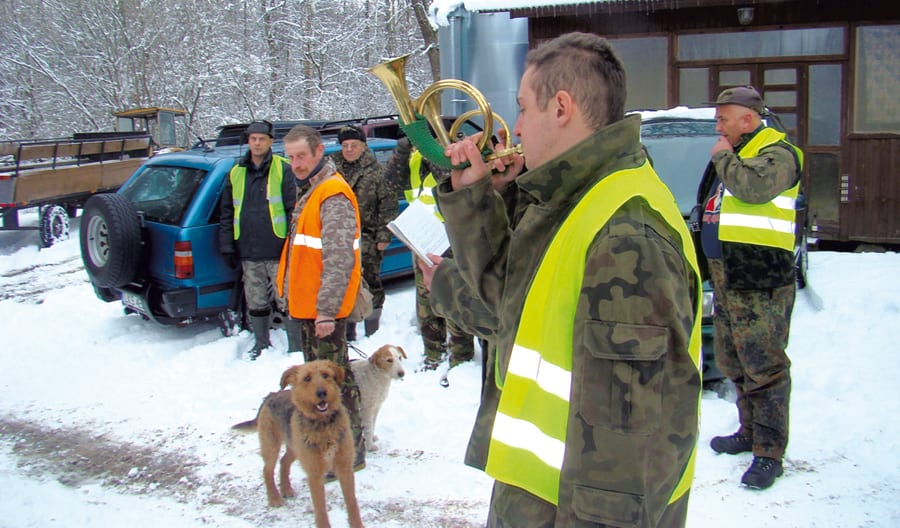 Polujemy na dwadzieścia dwie strzelby. Akordem kończącym odprawę jest losowanie stanowisk. Z całym oprzyrządowaniem, z tobołkami, siadamy do podwody. Aura nam sprzyja, ponowa, lekki mróz, błękitne niebo zapowiada udane polowanie.