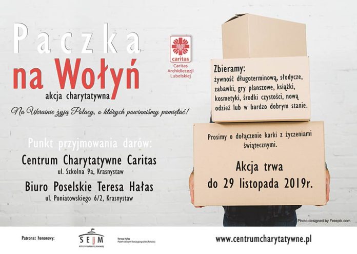 Akcja charytatywna „Paczka na Wołyń” odbywa się pod honorowym patronatem poseł Teresy Hałas i trwa do 29 listopada. – Zbieramy żywność długoterminową, słodycze, zabawki, gry planszowe, książki, kosmetyki, środki czystości, nową odzież lub w bardzo dobrym stanie. Prosimy również o dołączenie kartki z życzeniami świątecznymi – mówi Kowalczyk. Punkty przyjmowania darów mieszczą się przy Centrum Charytatywnym Caritas przy ul. Szkolnej 9a oraz Biurze Poselskim Teresy Hałas przy ul. Poniatowskiego 6/2. (k)