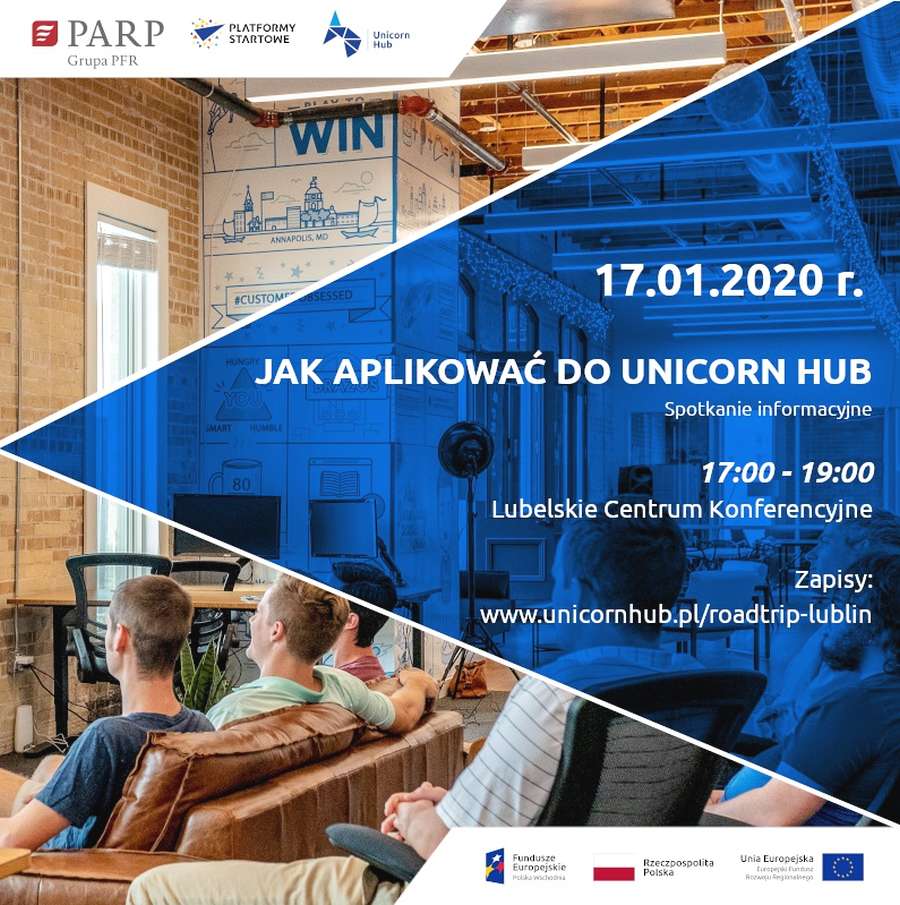 Już 17 stycznia 2020 r. w godzinach 17:00–19:00 w Lubelskim Centrum Konferencyjnym odbędzie się spotkanie informacyjne poświęcone programowi inkubacji i możliwości rozwoju innowacyjnych pomysłów w ramach Platformy Startowej Unicorn Hub. To spotkanie dla wszystkich, którzy myślą o rozpoczęciu własnego biznesu, a w szczególności tych, którzy mają innowacyjny pomysł na nowy produkt lub usługę.