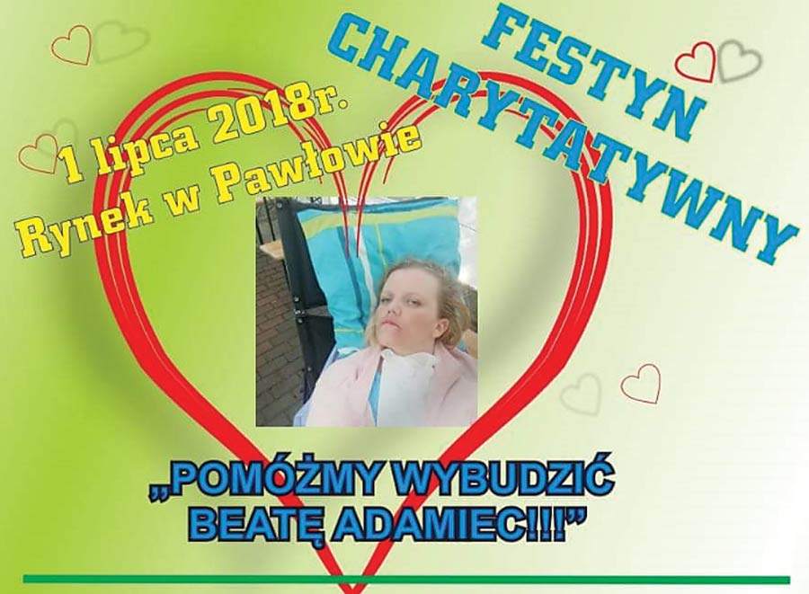 U mieszkanki Zalesia Krasieńskiego doszło do poważnego niedotlenienia mózgu zaraz po tym, gdy urodziła dziecko. Po 40-minutowej reanimacji udało się ją uratować, ale zapadła w śpiączkę. Konieczna jest intensywna rehabilitacja, ale to duży wydatek. Rodzina i przyjaciele organizują więc festyn, podczas którego zbierane będą pieniądze na leczenie Beaty Adamiec. Każdy może przyjść i wesprzeć ten szczytny cel. Festyn rozpocznie się o godz. 14.00. W akcję włącza się mnóstwo ludzi dobrej woli, którym zależy, aby pani Beata jak najszybciej odzyskała świadomość i wróciła do męża i dwójki synów (obecnie kobieta przebywa w Centrum Opieki i Rehabilitacji „Zdrowie” w Częstochowie).