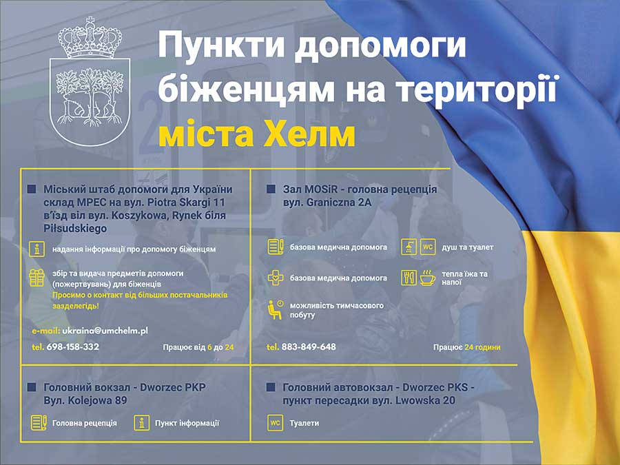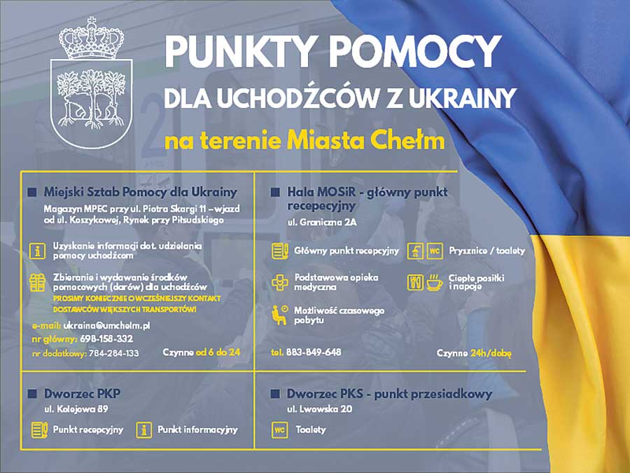 1. Czynny od godz. 6.00 do 24.00 – Miejski Sztab Pomocy dla Ukrainy, magazyn MPEC przy ul. Piotra Skargi 11 (wjazd od ul Koszykowej, rynek przy Piłsudskiego). Uzyskanie informacji dotyczącej udzielania pomocy uchodźcom, zbieranie i wydawanie darów dla uchodźców. Dostawcy większych transportów proszeni są o wcześniejszy kontakt (e-mail: ukraina@umchelm.pl; tel. 698 158 332, 784 284 133).
