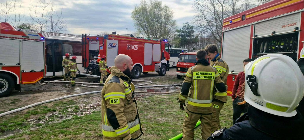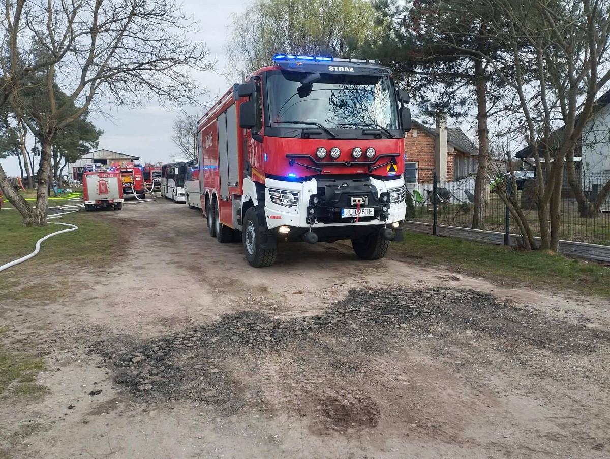 W sobotę (4 kwietnia) w miejscowości Ostrów w gminie Dorohusk doszło do groźnego pożaru na terenie jednej z firm transportowych. Ogień objął blaszany garaż, halę warsztatową oraz sześć pojazdów, w tym stare autobusy.