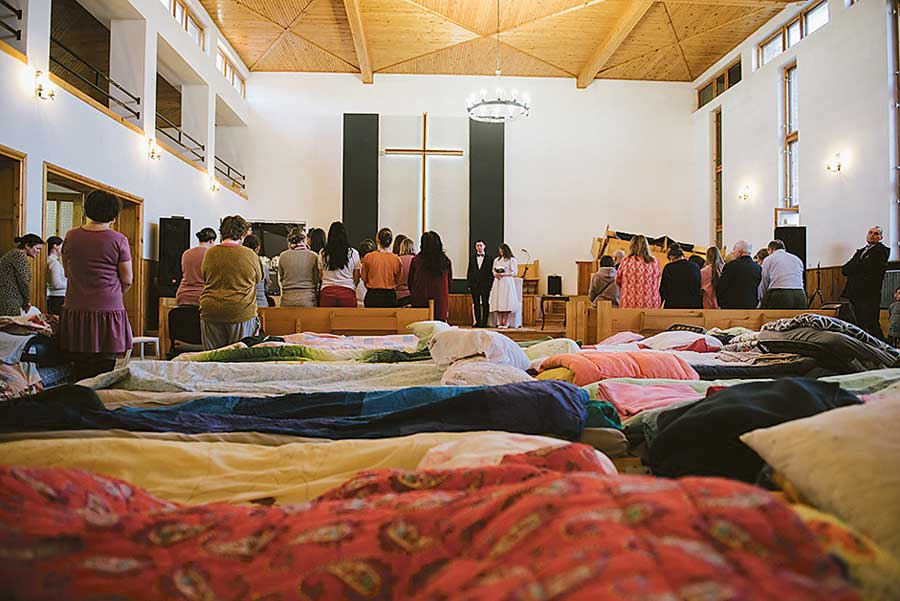 Aby zrobić miejsca na łóżka dla uchodźców, ławki z kaplicy zostały wyniesione (niedzielne nabożeństwa odbywają się w sali ChDK). Dzieci mają tu nawet swoją prowizoryczną salę zabaw. Od początku wojny na Ukrainie przez Zbór Kościoła Chrześcijan Baptystów w Chełmie „przewinęło się” około 3500 uchodźców. A to nie koniec. Kolejni zmęczeni, po kilkudziesięciu godzinach ucieczki przed rosyjskim okupantem, Ukraińcy znajdują schronienie w zborze. Są tu średnio przez dzień lub dwa, by odpocząć i nabrać sił na dalszą drogę.