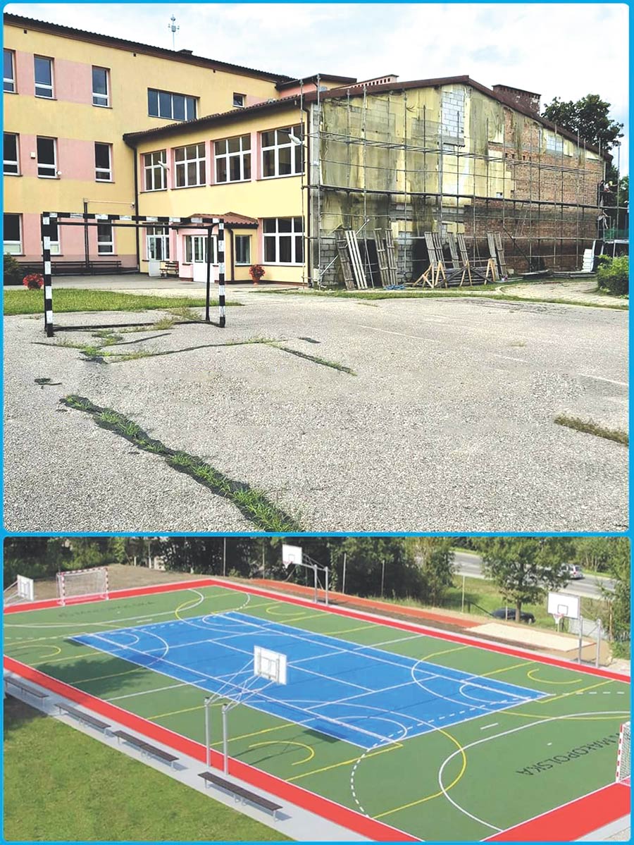 Powstanie uniwersalne boisko szkolne przeznaczone go do gry w piłkę ręczną, piłkę nożną i siatkówkę z możliwością zmiany funkcji na boisko do gry w koszykówkę lub tenisa ziemnego, bieżni prostej oraz skoczni. Projektuje się rozebranie istniejącego boiska asfaltowego i obiektów towarzyszących, a następnie wykonanie nowego boiska i urządzeń lekkoatletycznych o nawierzchni poliuretanowej z piłkochwytami po obwodzie boiska. Projektuje się odwodnienie liniowe terenu i odprowadzenie wody opadowej do studzienek chłonnych.