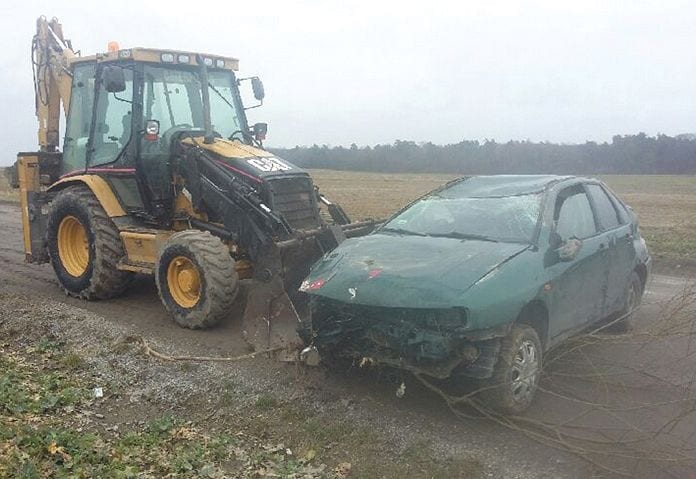 Do dość nietypowego zdarzenia doszło w piątek, ok. 13.00 w miejscowości Płonka (gmina Rudnik). Ze wstępnych ustaleń wynika, że tego dnia 34-letni mieszkaniec gminy Rudnik świętował urodziny. Trochę wypił i postanowił się przejechać. Wsiadł do seata, ale właśnie w Płonce stracił panowanie nad autem i dachował. Wpadł ze znajomymi na pomysł, by samochód przetransportować pod dom. Miała pomóc w tym koparko-ładowarka… Pech chciał, że o całym zajściu dowiedziała się policja. Gdy patrol pojawił się na miejscu, samochód znajdował się akurat na… łyżce koparki.