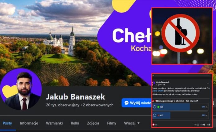 Na wprowadzenie zakazu sprzedaży alkoholu od 23 do 6 rano m.in. w turystycznej Okunince zdecydowali się ostatnio radni gminy Włodawa. Zacznie od obowiązywać od 2026 roku. W Chełmie dotąd ten problem nie był w ogóle podnoszony, ale po ostatniej awanturze o wprowadzenie prohibicji w Warszawie, temat wywołał prezydent Jakub Banaszek, pytając na swoim profilu na FB, czy w Chełmie powinniśmy wprowadzić nocną prohibicję? – Osobiście uważam, że tak, ale czekam na Państwa opinie – napisał włodarz miasta. Jak wynika z zamieszczonej przez niego ankiety podobnie uważa ponad 60 proc. internautów.