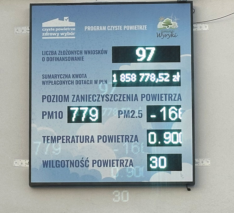 W ubiegłym tygodniu uwagę mieszkańców gminy Wyryki zwróciły niepokojące informacje wyświetlane na tablicy informacyjnej zamontowanej na budynku Urzędu Gminy. Urządzenie, które na bieżąco pokazuje m.in. dane dotyczące jakości powietrza, wskazywało skrajnie wysokie przekroczenia wszelkich norm.