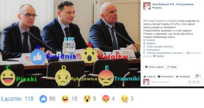 Wśród lokalnych samorządowców pojawiły się plotki, że podwyżka czynszu była odpowiedzią miasta na złośliwy mem wobec burmistrza Świdnika, jaki w internecie zamieścił współrządzący powiatem klub Świdnik Wspólna Sprawa. Powiatowa opozycja z PiS próbuje tymczasem przekonać mieszkańców, że władze starostwa tylko czekały na wypowiedzenie umowy najmu, bo będą teraz miały pretekst do przeniesienia siedziby powiatu w inne miejsce, nawet poza granice miasta. Ostatnio na funpage’u powiatowego Klubu Radnych PiS i Porozumienia Prawicy pojawiło się nawet zdjęcie zarządu powiatu z podpisem: „Po Powiecie Świdnickim krąży pogłoska, że obecny zarząd powiatu (PSL-PO) chce zabrać stolicę powiatu ze Świdnika. Autorzy ankiety proszą, aby internauci w komentarzach wypowiadali się, czy siedziba powiatu powinna pozostać w Świdniku, czy zostać przeniesiona do Mełgwi, Piask, Rybczewic, albo Trawnik”.