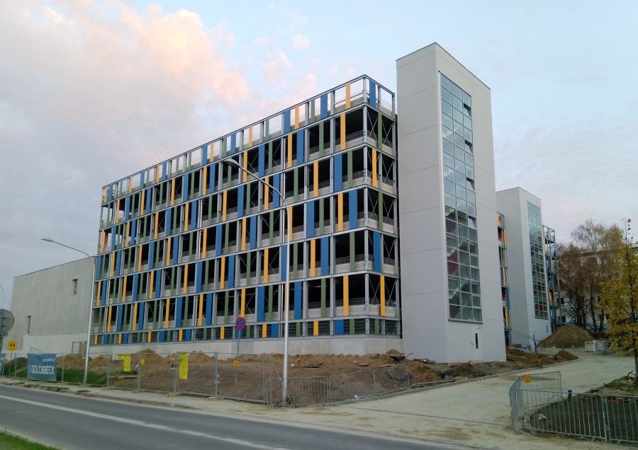 Cały obiekt powstaje w szybkim tempie, bowiem początek inwestycji przypadł na wiosnę tego roku. Wykonawca w pierwszym etapie dokonał wyburzenia wyłączonych z użytku budynków po dawnej kotłowni węglowej wraz z podziemnym składem opału. Następnie budowlańcy przystąpili do zasadniczej części inwestycji. W jej ramach powstaje parking o siedmiu poziomach w północnym i południowym segmencie, które połączy ze sobą pięciopoziomowy łącznik.
