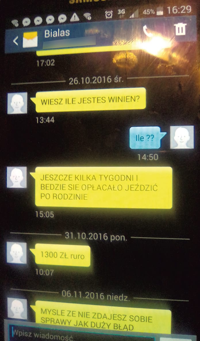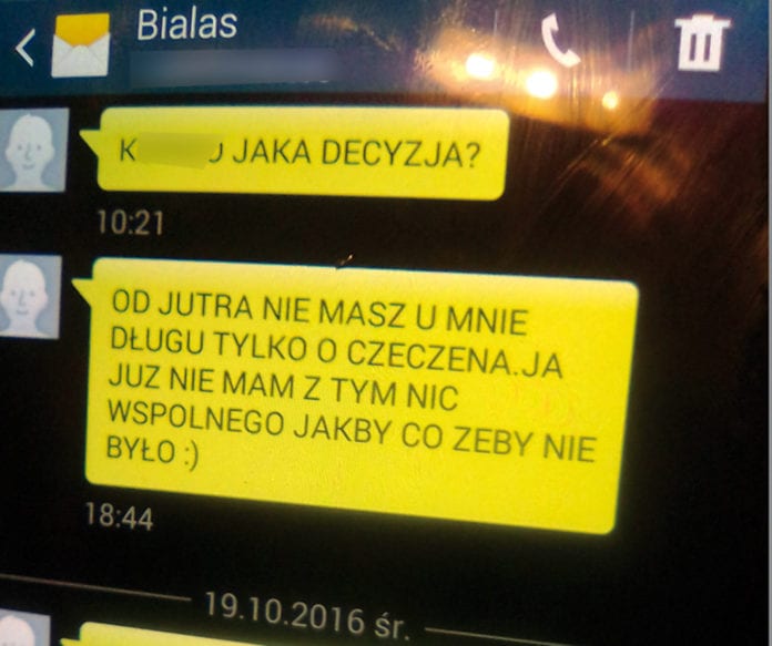 „Ku..o sprawa wygląda następująco, pożyczyłeś pieniądze na 3 dni. Po kilku tygodniach proszenia i dzwonienia postanowiłem dorzucić procent, bo tak robią Chwilówki (…) Jak pomyślisz o odwecie, będziesz się musiał daleko ukryć, co nie zagwarantuje ci bezpieczeństwa ani twojej córce, która nic nie zawiniła. Chcesz przemocy? Będziesz ją miał, bo jak widzisz stawka rośnie” – tak wygląda treść jednego z SMS-ów, jakie chełmski radny, Paweł Białas, wysłał do mężczyzny. Straszył, że może się coś stać również narzeczonej dłużnika, wysyłając mu zdjęcie kobiety. „Jak pójdziesz na policję, wszyscy się dowiedzą jaką jesteś szmatą a pretensje miej tylko do siebie (…) Zmuszę cię do tego, żebyś dostał dobrą nauczkę kosztem wszystkiego” – zastraszał w innym sms-ie. Wszystkie wiadomości są dowodami w sprawie.
