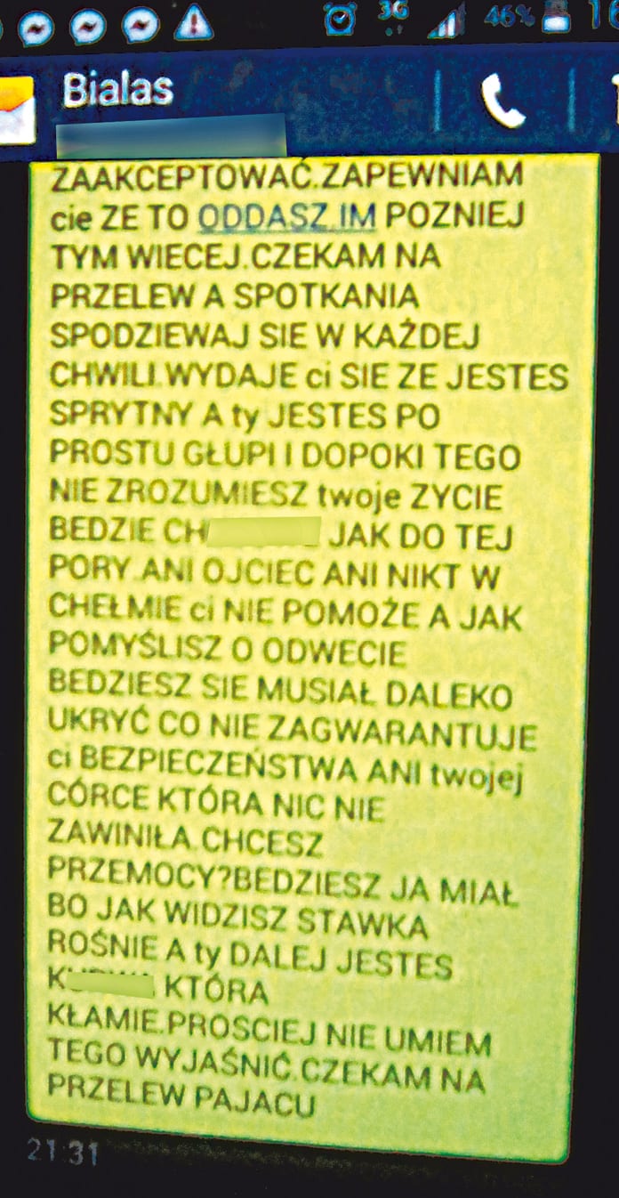 Aferę z udziałem radnego ujawniliśmy w poprzednim numerze. Pod koniec listopada do komendy policji zgłosił się jeden z funkcjonariuszy Zakładu Karnego w Chełmie i złożył zawiadomienie, że Paweł Białas, chełmski radny, groził mu i jego bliskim, domagając się zwrotu 1800 złotych długu, choć faktycznie zaległość wynosiła 100 zł. Jako dowód przedstawił otrzymane od radnego sms-y, w których Białas nie tylko wyzywa go od najgorszych, ale grozi egzekucją długu przez Czeczenów i tym, że może się coś stać jego narzeczonej oraz 3-letniej córce. „Chcesz przemocy, będziesz ją miał” – odgrażał się dłużnikowi radny Białas. Na dodatek miejski rajca zaczaił się przed więzieniem i… opluł dłużnika, gdy ten szedł do pracy.