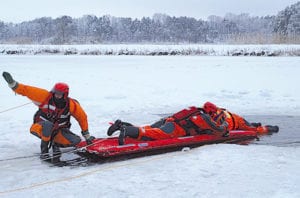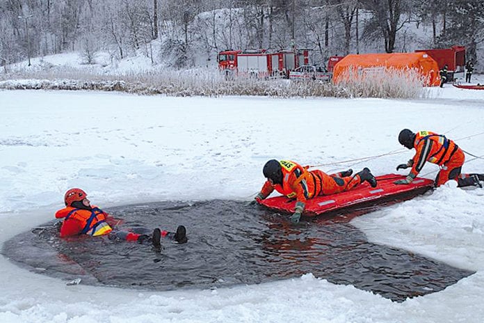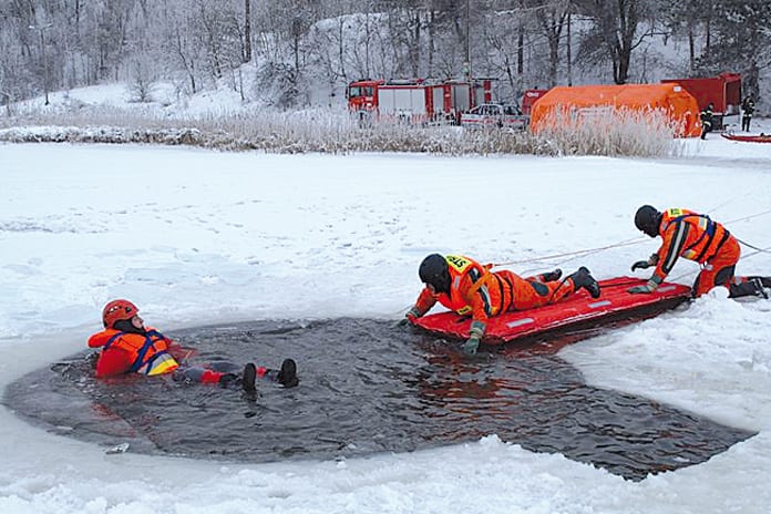 Opisane wyżej zdarzenie miało miejsce 18 stycznia i na szczęście było tylko scenariuszem ćwiczeń zorganizowanych przez Komendę Powiatową Państwowej Straży Pożarnej w Krasnymstawie. Najpierw w siedzibie komendy odbyła się cześć teoretyczna szkolenia, obejmująca podstawowe wiadomości o strukturze i parametrach lodu, udzielaniu pomocy medycznej osobom poszkodowanym przy wychłodzeniach i technikach ewakuacji poszkodowanych. Na szkoleniu zaprezentowano też strażakom sprzęt używany w ratownictwie lodowym. Część praktyczna odbyła się na zbiorniku w Tuligłowach. W ćwiczeniach wzięli udział strażacy z Krasnegostawu oraz z jednostek OSP KSRG, tj.: Krakowskie Przedmieście, Ostrzyca, Siennica Różana i Żółkiewka. (k)