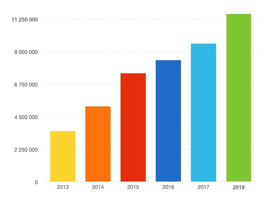 Wykres z liczbą e-PIT-ów w poszczególnych latach od momentu, od kiedy można składać deklaracje przez internet. W 2013 roku, gdy po raz pierwszy wypełniano e-Pity, na ten krok zdecydowało się 2 250 000 osób. Po pięciu latach zanotowano pięciokrotny wzrost!