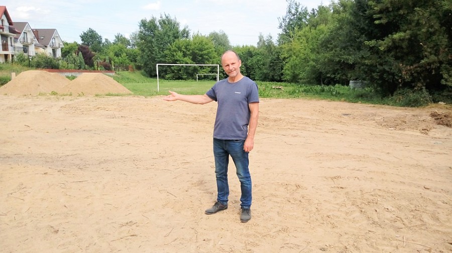 Boiska na osiedlu domków jednorodzinnych będą miały nawierzchnię poliuretanową. Obecnie trwa wyrównywanie terenu pod inwestycję, bo teren pod budowę znajduje się w dość wysokim stromym.