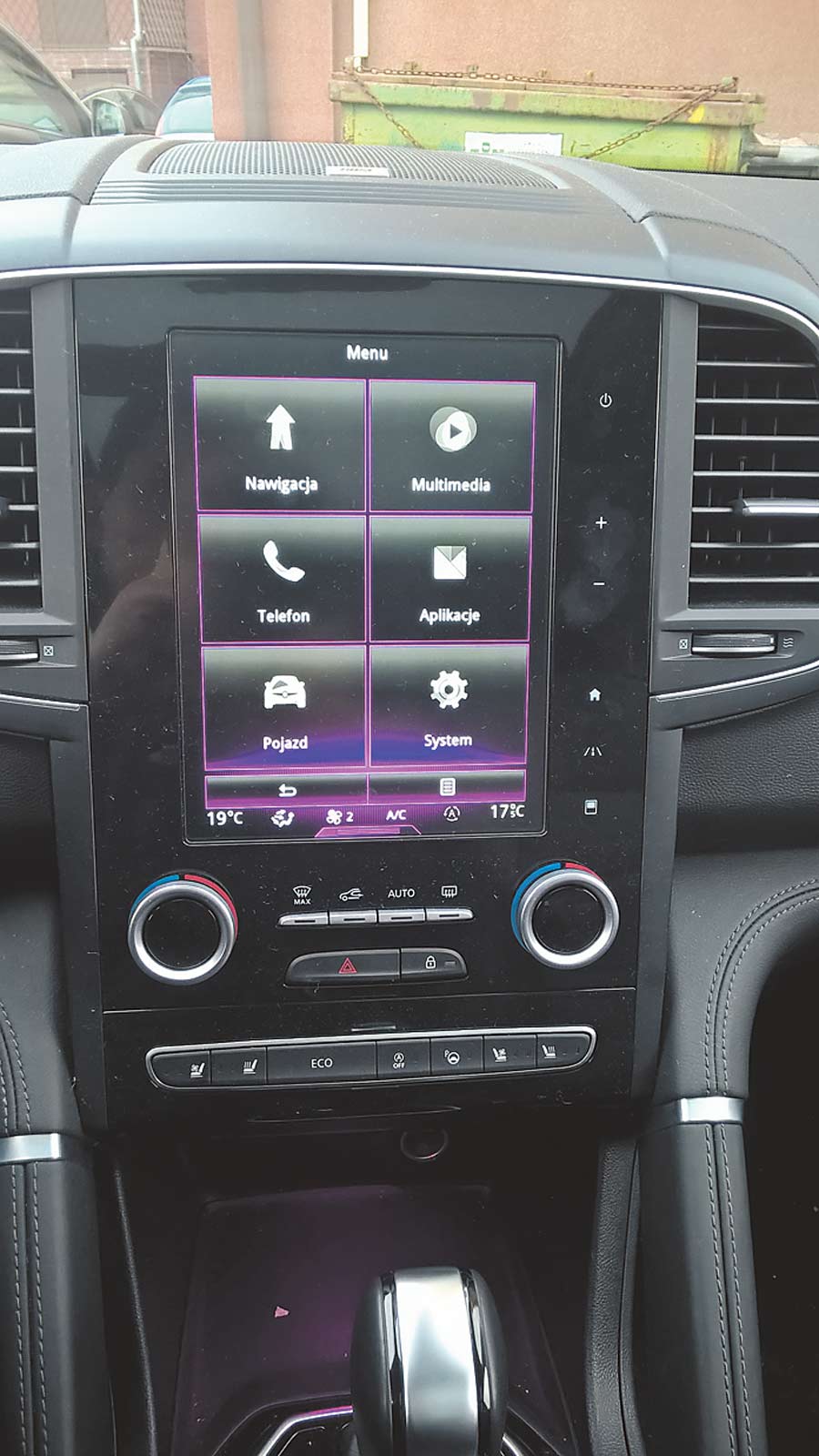 Wnętrze Koleosa bardzo przypomina kabiny Talismana, czy Megane. Znaki szczególne to płaska, pionowa konsola, w którą wbudowano wielki wyświetlacz, pod którym znalazło się też miejsce na manualny panel sterowania klimatyzacją i nawiewami. Dla mnie minusem jest brak fizycznego pokrętła do regulacji głośności radia, choć z drugiej strony znajduje się on na kierownicy, więc alternatywa jest. Plus dla Renault należy się za umieszczenie z boku ekranu głównych skrótów do obsługi systemu, co bardzo ułatwia korzystanie z niego podczas jazdy.