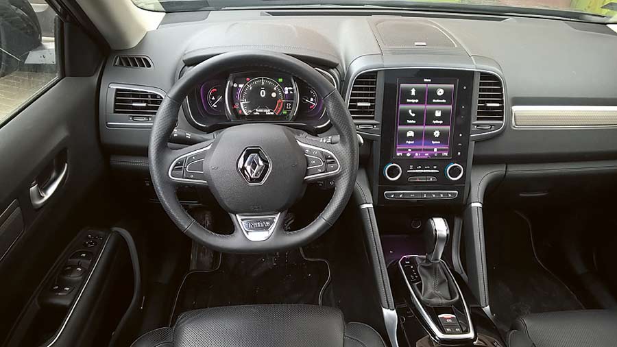 Bardzo ładnie prezentują się zegary – środkowy obrotomierz może wyświetlać wszystkie wskazania komputera pokładowego, a po jego bokach, oddzielone ściankami, umieszczono wskaźnik poziomu paliwa i temperatury. Koleos dysponuje świetnymi fotelami, oczywiście z funkcją masażu oraz mnóstwem miejsca w kabinie. Piątka dorosłych pasażerów, nawet o ponadprzeciętnym wzroście, nie będzie narzekać na brak miejsca ani na nogi, ani nad głową. Bagażnik tego samochodu ma pojemność aż 579 l, i to przy rozłożonej kanapie.